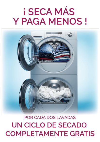 Ahorra más del 25%, aprovecha un secado gratis por cada dos lavadas.